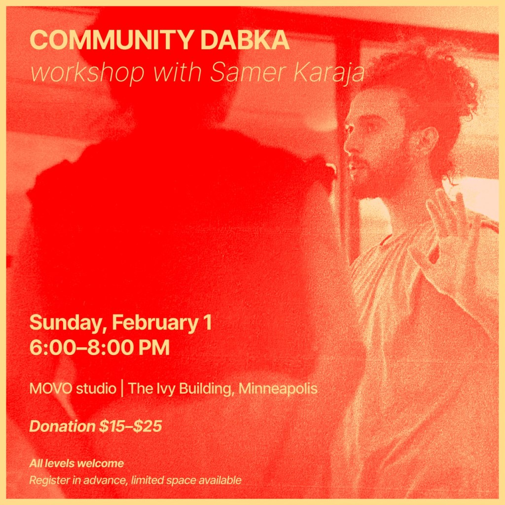 Community Dabke workshop is open to all levels, welcoming participants to experience Palestinian folk dance through communal footwork and specific rhythmic steps. Come experience the collective joy of this form while also learning about and embodying the global momentum of Palestinian life force.