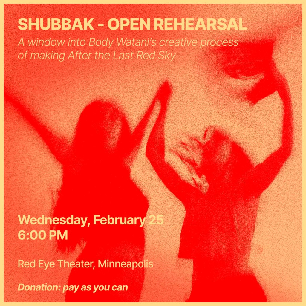 SHUBBAK // شُبَّاك meaning ‘window’ in Arabic, is an invitation to welcome our community into the creative process of the performance: After the Last Red Sky by Body Watani Dance Project. In this offering we will weave performing excerpts of the work with conversations and discussions about the creative process, stories and contexts embedded in the work.